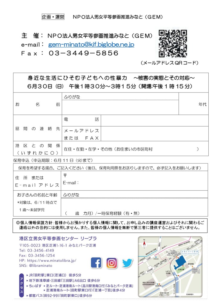 ■問合せ先・申込先:NPO法人男女平等参画推進みなと(GEM)まで