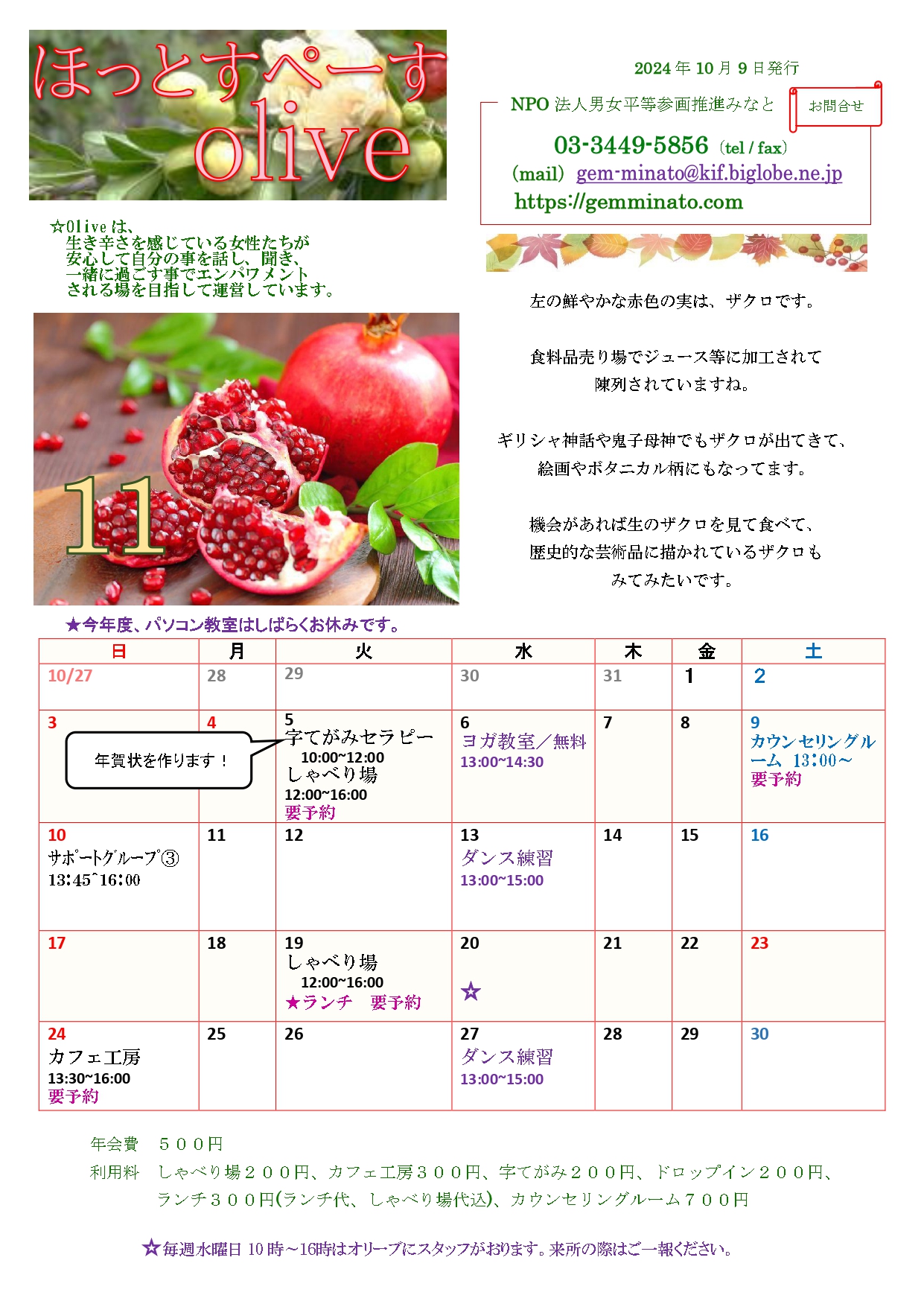 11月のオリーブ予定表 2024年10月25日2024年11月9日 男女平等参画推進みなと ☆Olive(オリーブ)は、生きづらさを感じている女性たちが安心して自分の事を話し、聞き、一緒に過ごす事でエンパワメントされる場を目指して運営しています。 詳細は、こちらをご覧ください。場所は非公開です。お問い合わせの上、ご参加ください。お問い合わせの際は、こちらからお越しください。 共有: クリックして X で共有 (新しいウィンドウで開きます) X Facebook で共有するにはクリックしてください (新しいウィンドウで開きます) Facebook いいね 読み込み中… 関連
