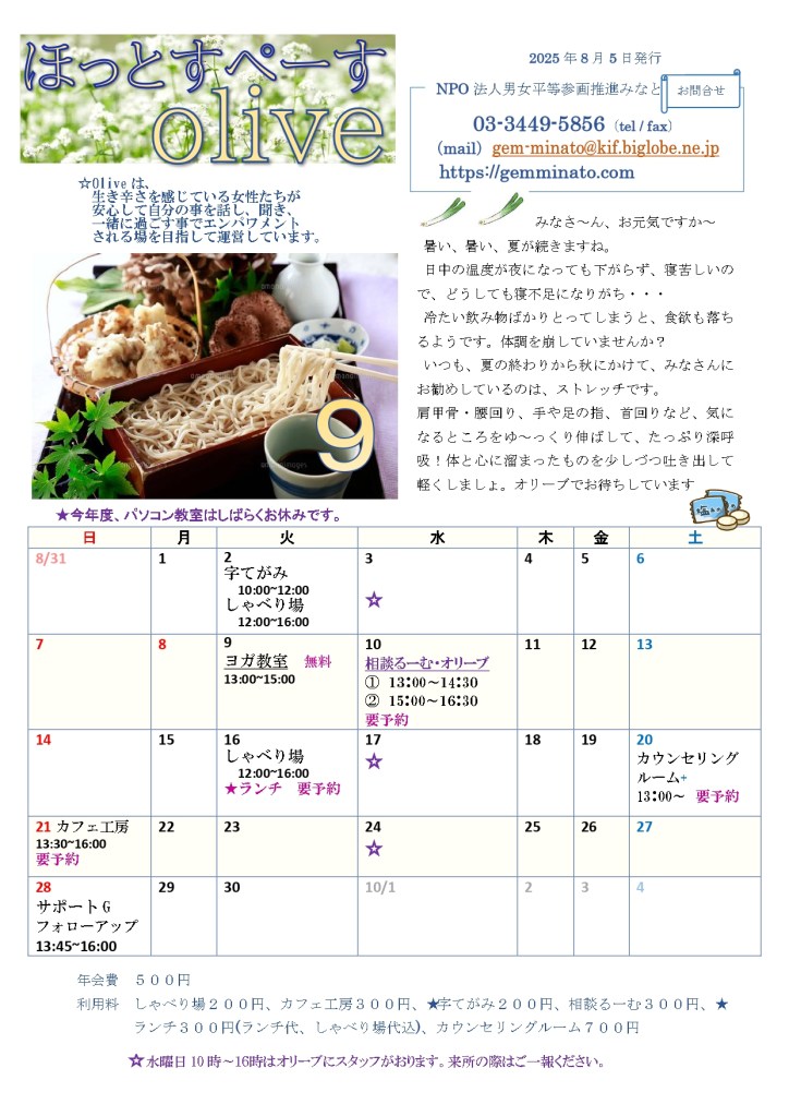 9月のオリーブ予定表 2025年8月24日 男女平等参画推進みなと ☆Olive(オリーブ)は、生きづらさを感じている女性たちが安心して自分の事を話し、聞き、一緒に過ごす事でエンパワメントされる場を目指して運営しています。 詳細は、こちらをご覧ください。場所は非公開です。お問い合わせの上、ご参加ください。申し込みやお問い合わせの際は、こちらからお越しくださいね。 共有: クリックして X で共有 (新しいウィンドウで開きます) X Facebook で共有するにはクリックしてください (新しいウィンドウで開きます) Facebook いいね 読み込み中… 関連