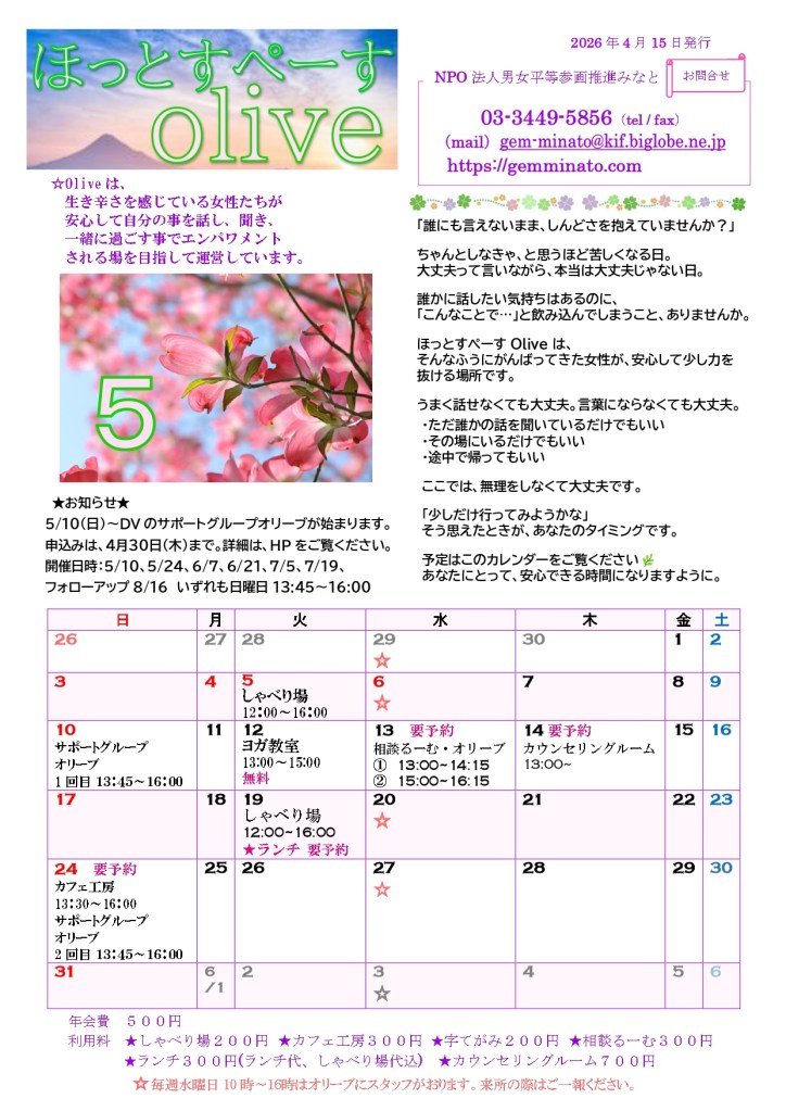 5月のオリーブ予定表 2026年4月26日 男女平等参画推進みなと ☆Olive(オリーブ)は、生きづらさを感じている女性たちが安心して自分の事を話し、聞き、一緒に過ごす事でエンパワメントされる場を目指して運営しています。女性だけの居場所です。安心して参加できます。場所は非公開です。お問い合わせの上、ご参加ください。詳細は、こちらをご覧ください。申し込みやお問い合わせの際は、こちらからお越しくださいね。 共有: X で共有 (新しいウィンドウで開きます) X Facebook で共有 (新しいウィンドウで開きます) Facebook いいね 読み込み中… 関連